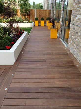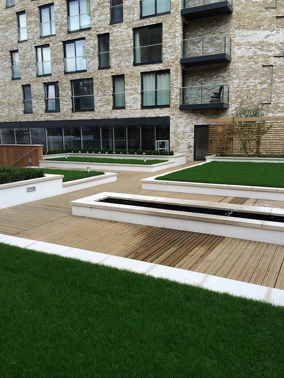 In Septmber 2014 we completed and biggest and most impressive decking project to date, Marine Wharf Deptford, South East London. We were tasked with laying 1200 square metres of decking to a podium area 1 story high as well as laying turf, river washed stone and an extensive amount of trees and plants The below pictures detail just how stunning the end result is: